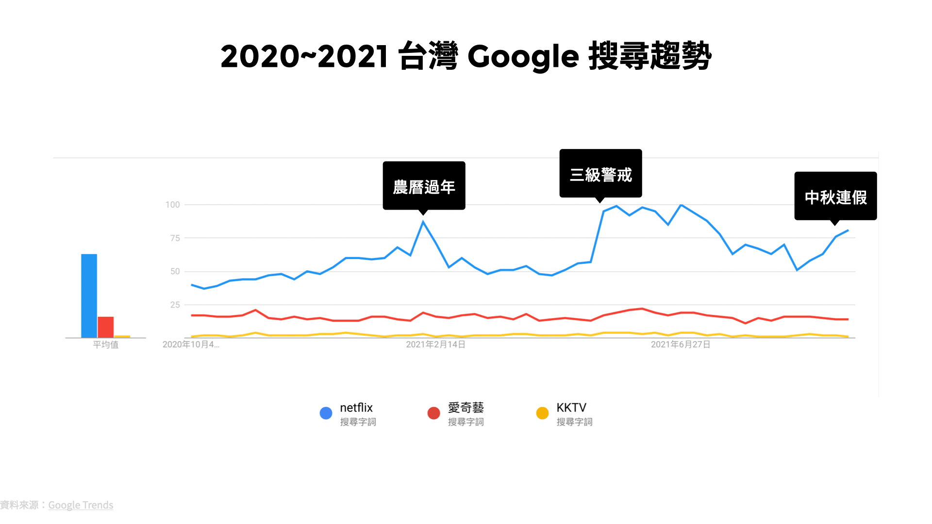 結果非常有趣,三個關鍵字的搜尋熱度排名跟 2020 市占率排名是一樣的,而在趨勢圖上看到幾個明顯的波鋒現象-全部都是民眾長時間待在家裏的時候。即使沒有被疫情影響,農曆過年時民眾還是想找影劇看,而三級警戒期間、中秋連假時趨勢來到高峰,也因此可以預測,國慶連假的時候,民眾追劇的需求又會增加,Netflix 必定是十分熱門的搜尋關鍵字。