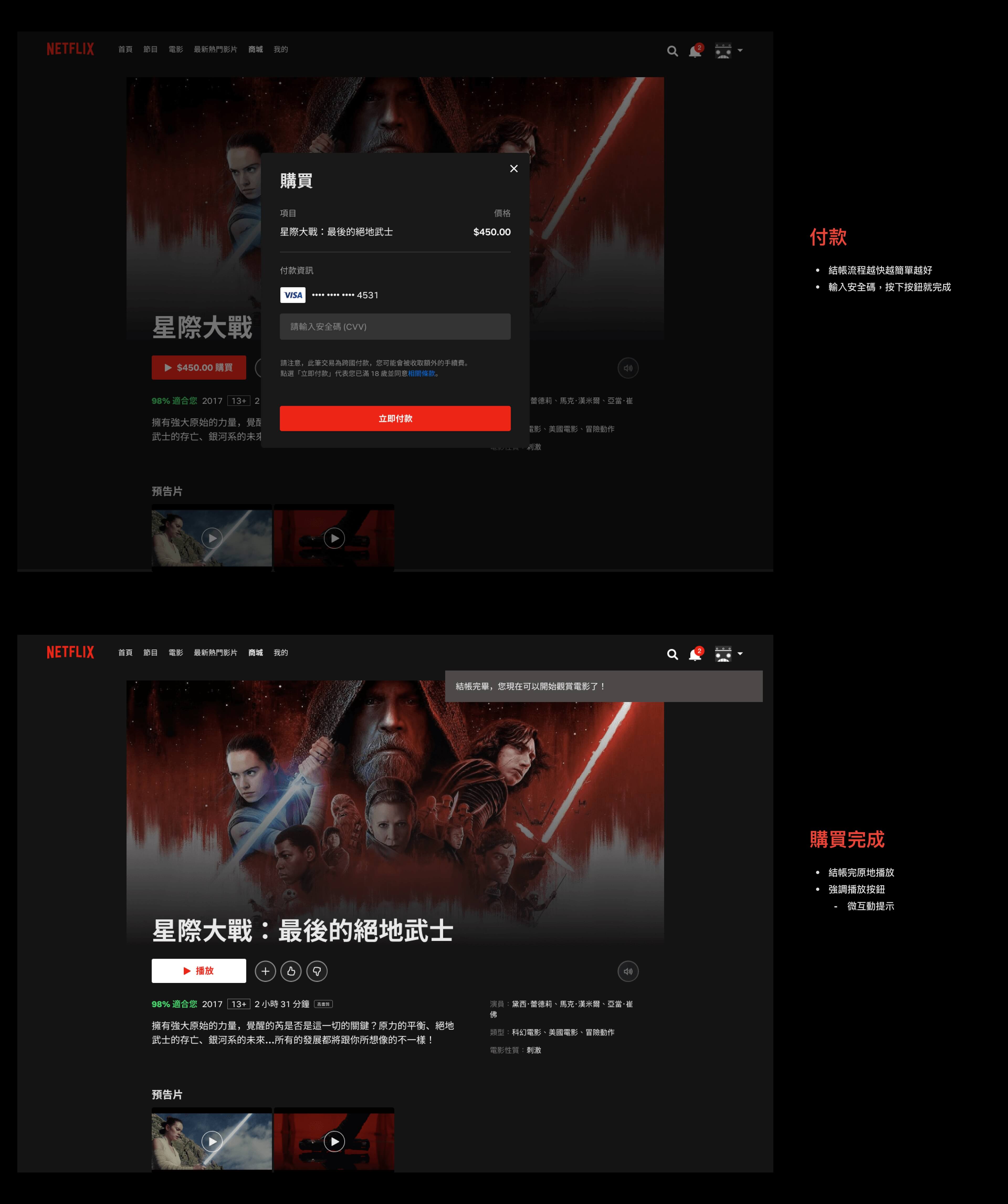 假設 Netflix 基於現在的訂閱模式,決定新增單片購買的商業模式,請規劃從「內容」到「購買」的使用者流程,包含基本的使用者/市場研究到 flow,以及關鍵畫面的 UI 設計。